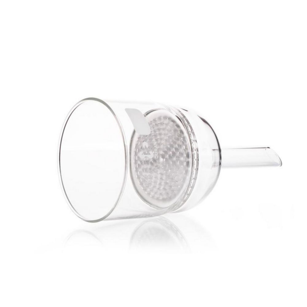 Trichter mit plangeschliffenem Schlitzsieb. Glasart 1 / Neutralglas nach USP / EP und JP. Autoklavierbar.