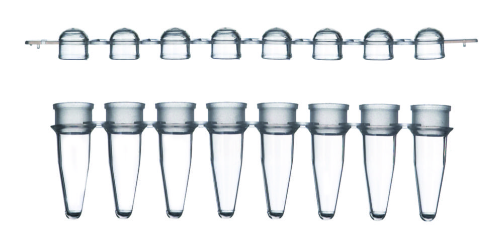 Produktinformationen "LLG-PCR-Tubes, 8er Strips mit separatem Deckelstreifen, PP | Beschreibung: 8er Strips PCR-Tubes mit separatem Deckelstreifen, flache Deckel"