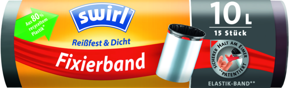 Das Fixierband umschließt den Mülleimerrand fest und verhindert das Hineinrutschen in den Eimer. Zum Entsorgen wird das Fixierband einfach verknotet und als Tragegriff verwendet.
