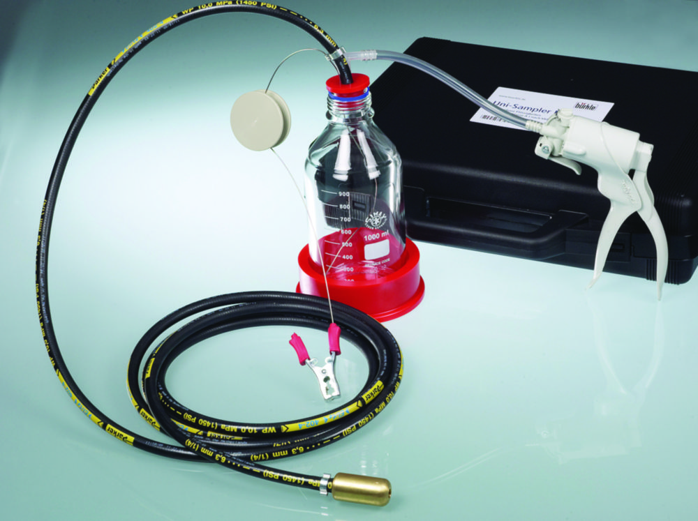 Lieferumfang: UniSampler mit 4 m Schlauch, Glasflasche, Vakuumpumpe, Flaschenadapter, Schlauchgewicht aus Messing und Erdungskabel im Transportkoffer