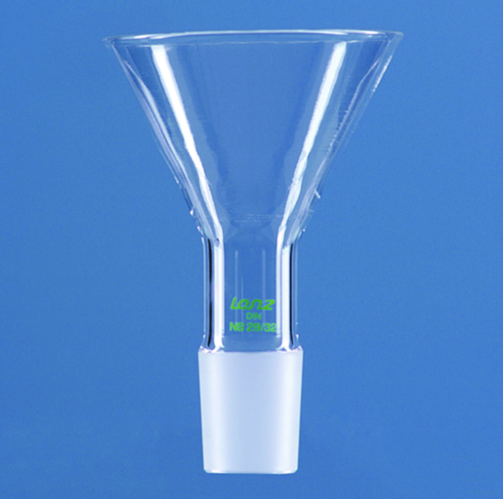 Hergestellt aus DURAN®-Rohr. Einfülltrichter (Winkel: 60°), mit NS-Kern.
