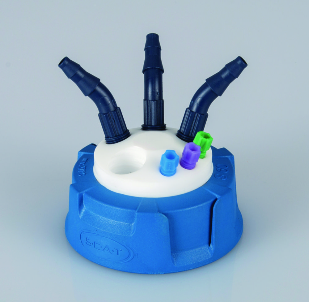 Für die sichere Entsorgung von Flüssigkeiten. Schraubkappen, mit frei drehbarem Einsatz aus PTFE, mit PFA-Fittings für Kapillaren, Schlaucholiven für Schläuche mit 5,0 - 11,5 mm Innendurchmesser und einem Anschluss für Abluftfilter. Der Abluftfilter muss separat bestellt werden.