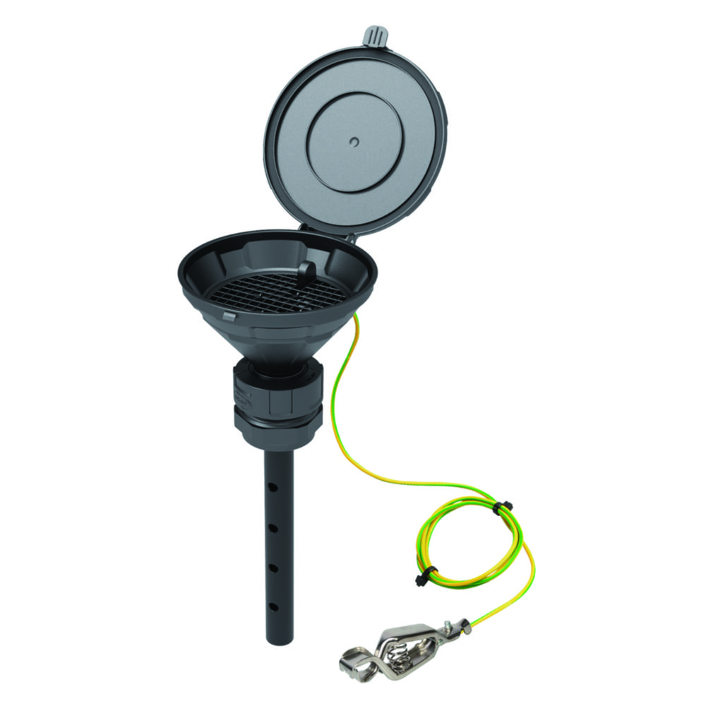 - Sicherheitstrichter in schwarz sind aus ableitfähigem HDPE und haben einen Erdungsanschluss zur Vermeidung von Zündgefahren. Erdungskabel (1,5 m) und Anschlussklemme sind im Lieferumfang enthalten