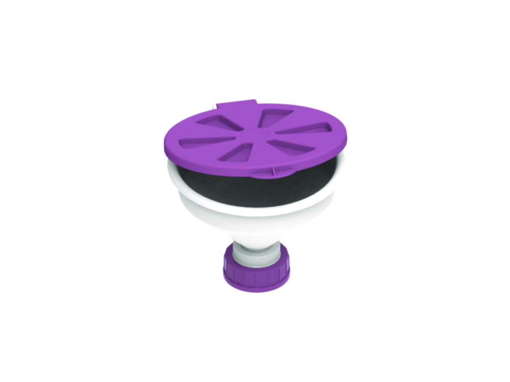 Sicherheitstrichter aus PP mit Scharnierdeckel zum sicheren Sammeln von Lösungsmittelabfällen. Die Trichter sind mit einem Schutzsieb aus PTFE ausgestattet.
