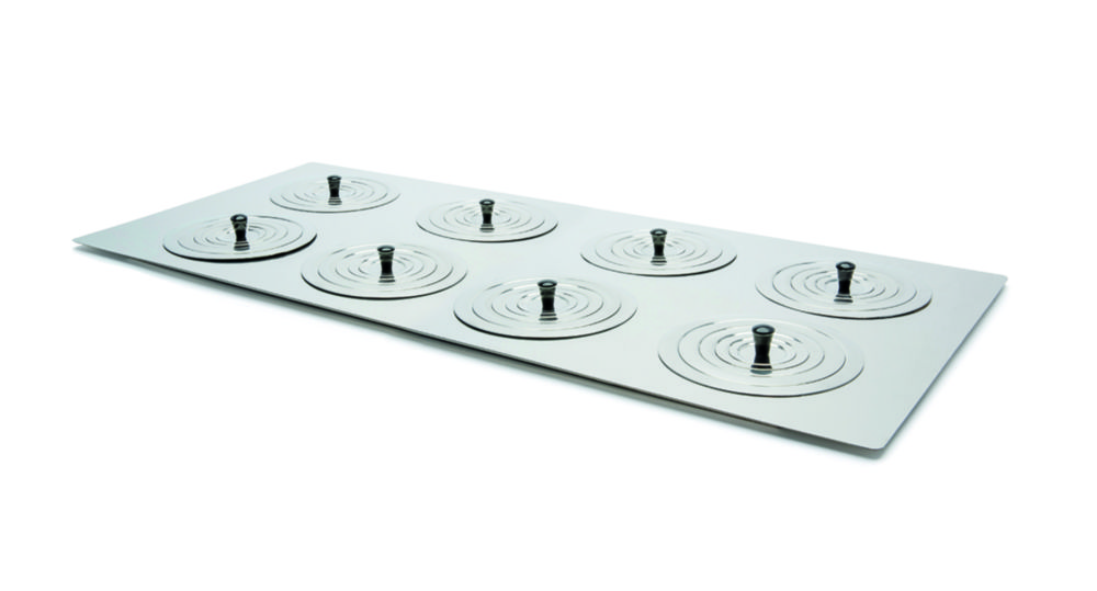 Flachdeckel für thermostatische Wasserbäder. Mit Ringsets von variablen Durchmesser zur Aufnahme großer Schiffe bei gleichzeitiger Reduzierung Verdunstung.