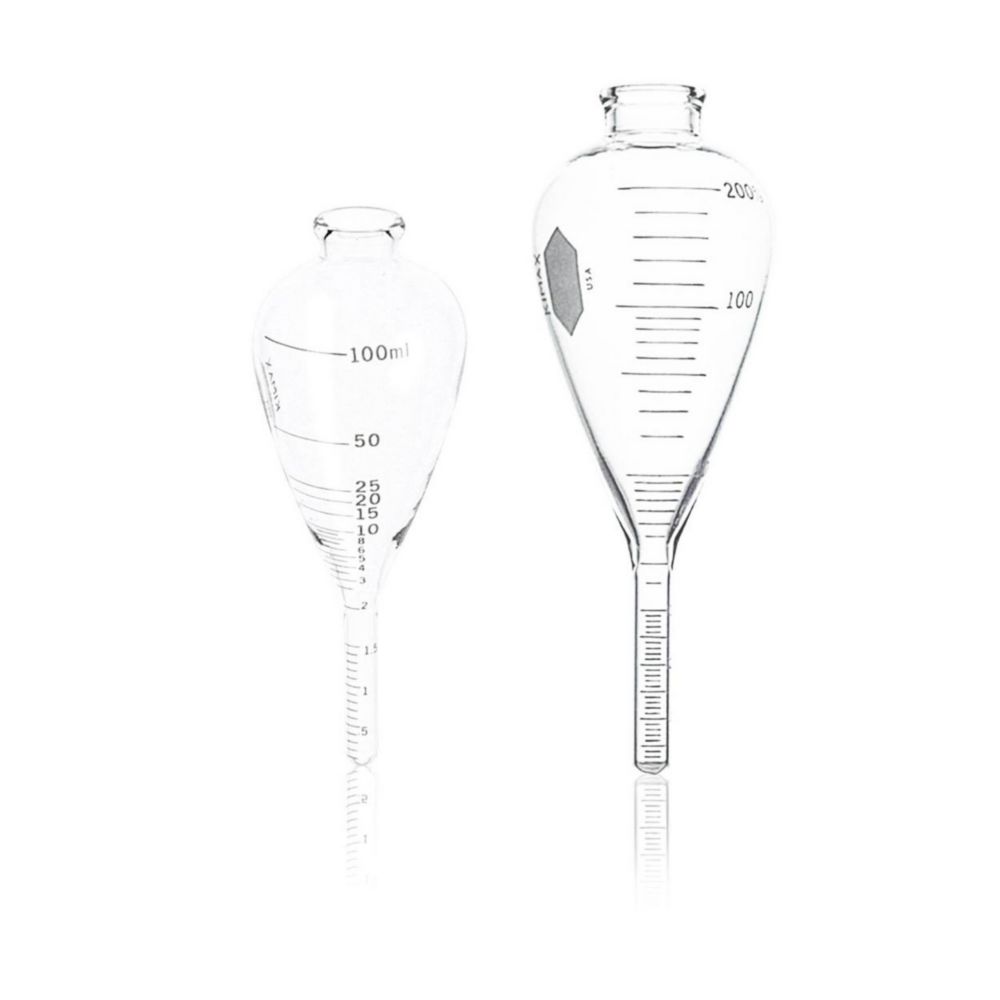 Zur Bestimmung von Bodensediment und Wasser in Erdölprodukten. Kalibriert. Stielvolumen 1,5 ml. Graduierung und Beschriftung in weißer Emailfarbe. Hergestellt nach USP Typ I und ASTM E438, Typ I, Klasse A Anforderungen.