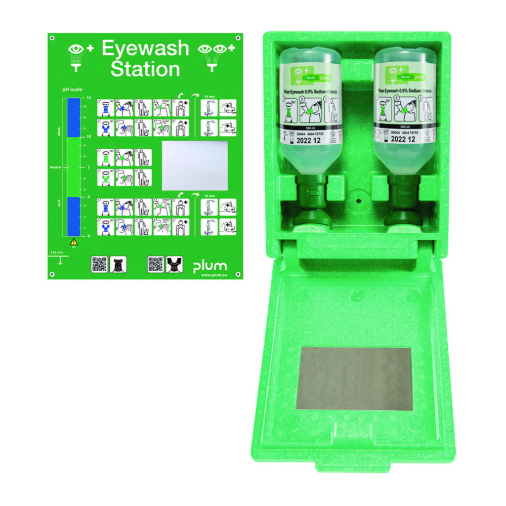 Augenspülstation in staubgeschützter Wandbox. Mit zwei Augenspülflaschen mit 500 ml steriler Natriumchloridlösung (0,9%), integriertem Piktogramm und Spiegel. Besonders für den Einsatz an Arbeitsplätzen geeignet, wo Staub und Schmutz anfallen (z.B. Werkstätten).