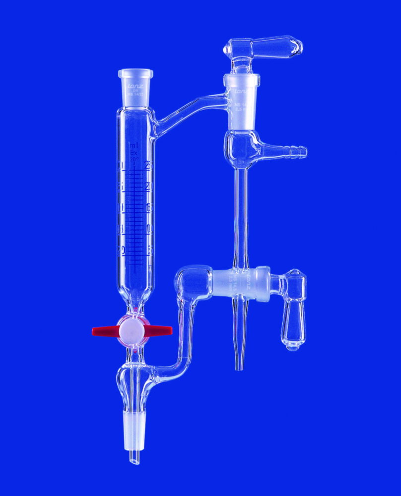 Hergestellt aus DURAN®-Rohr. Zwischenvorlage mit geradem Vorstoß, graduiert. Mit Kern und Hülse, Absaugstutzen GL 18. NS-Hahn wahlweise mit Glas- oder PTFE-Küken.
