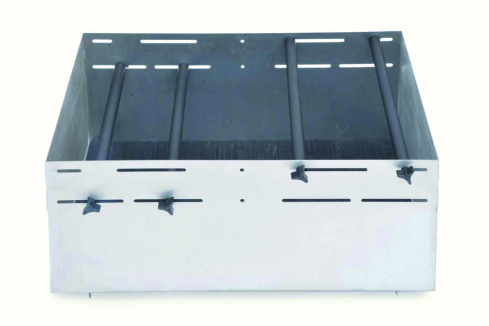 Verstellbare Klemmenstangen passen sich an verschiedene Gefäßtypen an. Die Basisschale verfügt über eine rutschfeste Oberfläche. Plattformen mit breitem Gefäßträger sind ideal für breite Probencontainer, wie Ballons, Krüge und Flaschen.