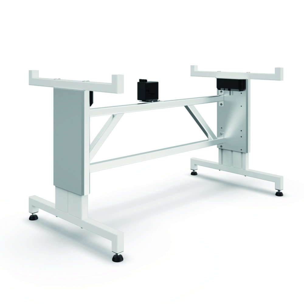 Die Untergestelle sind elektrisch höhenverstellbar. Der gesamte Arbeitsplatz wird mittels zweier integrierter Hubzylinder angehoben bzw. gesenkt und passt sich somit dem Benutzer an. Mit justierbaren Füßen.