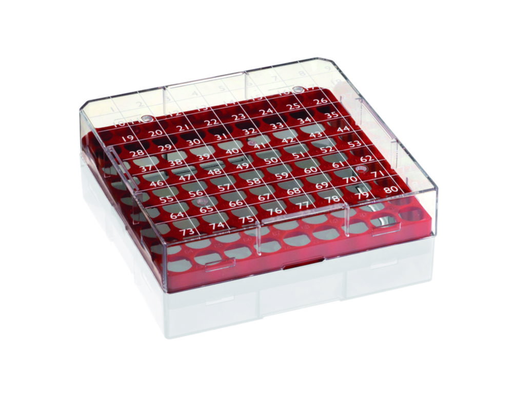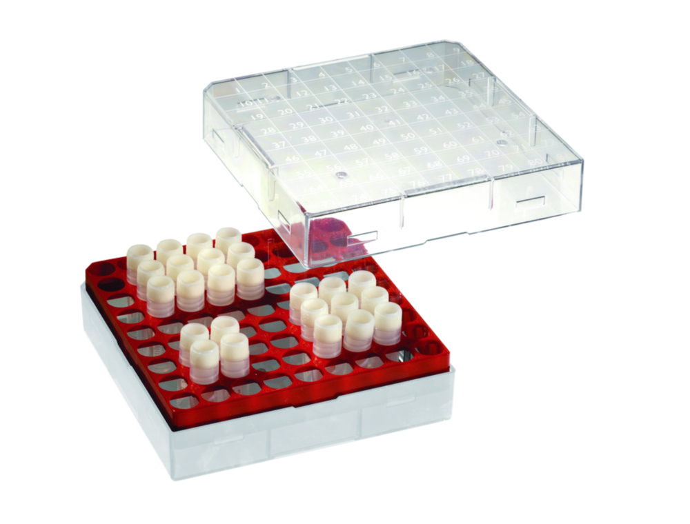 Deckel numerisch codiert. Temperaturbereich -190 - 121 °C. Zum Einsatz in Flüssigstickstoff geeignet. Autoklavierbar. Mit Stapelecken und Ablauföffnungen für Tauflüssigkeit und Stickstoffgas. Für Kryoröhrchen bis 12,3 mm Durchmesser. Ohne Rastereinsatz auch für größere Gefäße verwendbar.