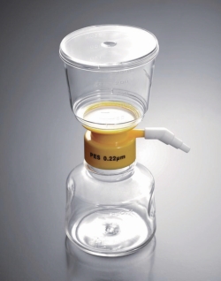 Kompletteinheiten mit Auffanggefäß für die Sterilfiltration von wässrigen Lösungen und Medien, insbesondere im Bereich Zellkultur. Einfache und sichere Handhabung. Die eingebaute Membran aus Polyethersulfon (PES) garantiert extrem gute Durchflusszeiten und niedrige Proteinbindung und ist daher ideal für die Filtration von proteinhaltigen Lösungen. Das Auffanggefäß wird mit Verschlussdeckel geliefert.