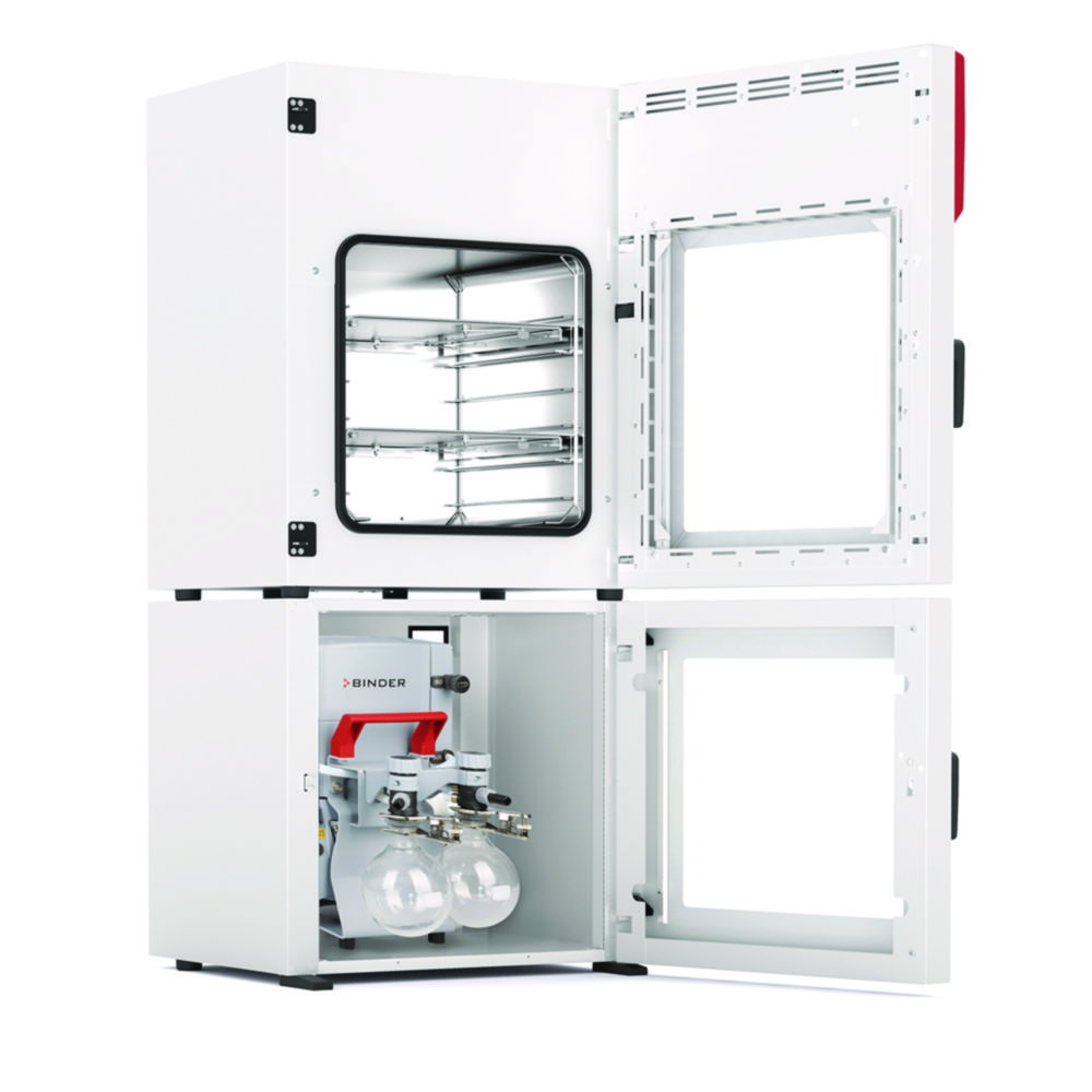 Set aus Vakuumpumpe VP2, Pumpenschrank (Unterschrank) zur Aufnahme der Pumpe und Anschlusskit zum Verbinden der Pumpe mit dem Vakuumtrockenschrank der VD Serie. Der Unterschrank bringt den Vakuumtrockenschrank auf eine ergonomische Arbeitshöhe, mindert das Pumpengeräusch und schützt die Pumpe vor mechanischer Beschädigung. Im Pumpenschrank befindet sich eine schaltbare Steckdose, die über den Regler des Vakuumtrockenschranks angesteuert werden kann.