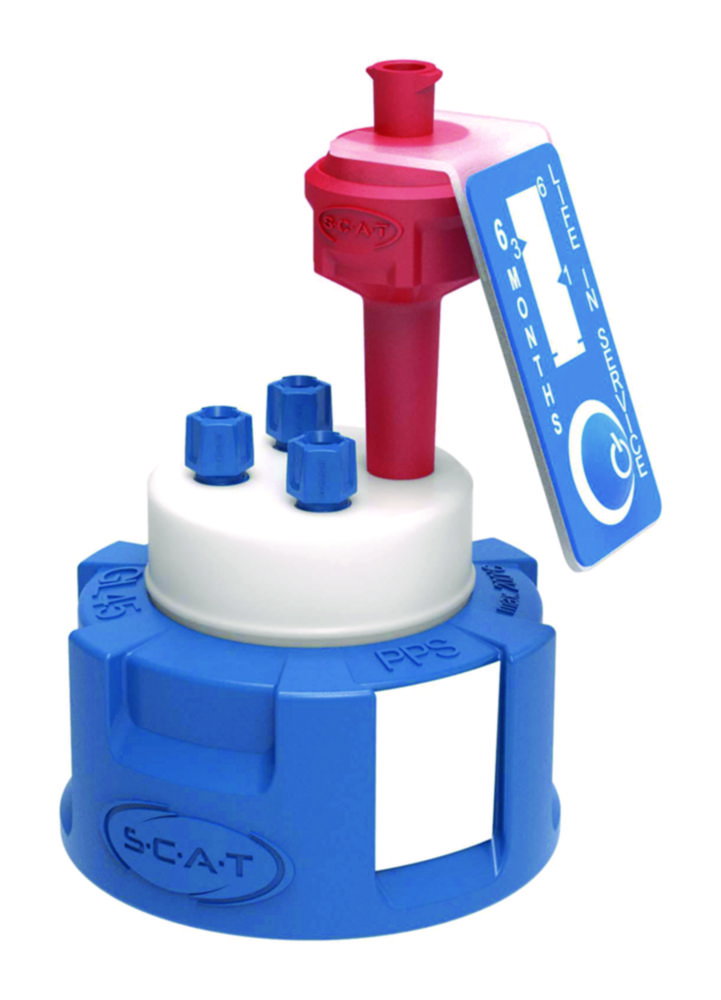 Für die sichere Entnahme von Flüssigkeiten. Schraubkappen, mit frei drehbarem Einsatz aus PTFE, mit PFA-Fittings für Kapillaren und einem Belüftungsventil. Für eine sichere Funktion empfehlen wir den Austausch des Belüftungsventils alle 6 Monate.