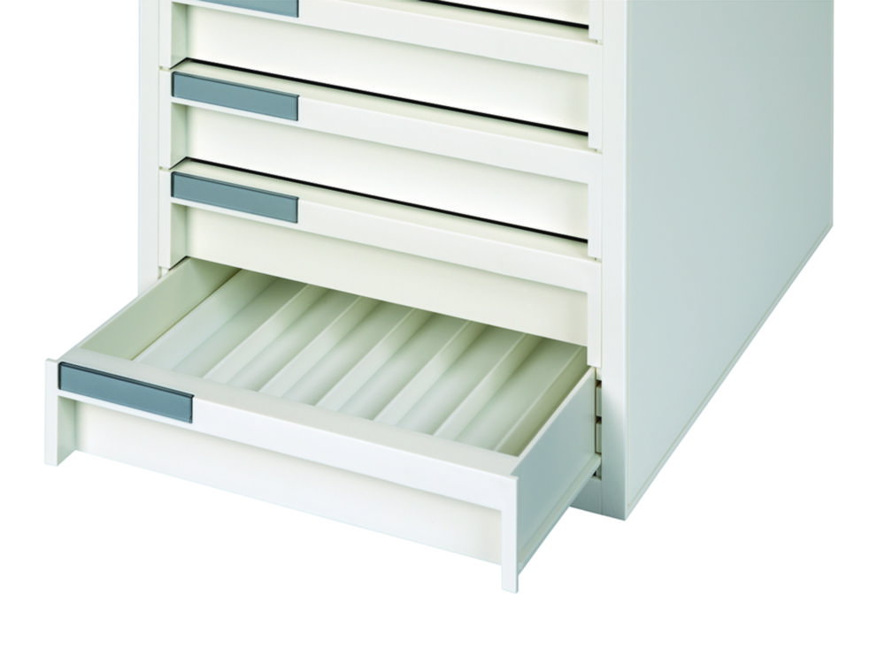 Weiße, modulare Schubladenbox mit 6 Schubladen als Aufbewahrung für Histologiekassetten, Dokumente, sowie kleinere Laborutensilien.