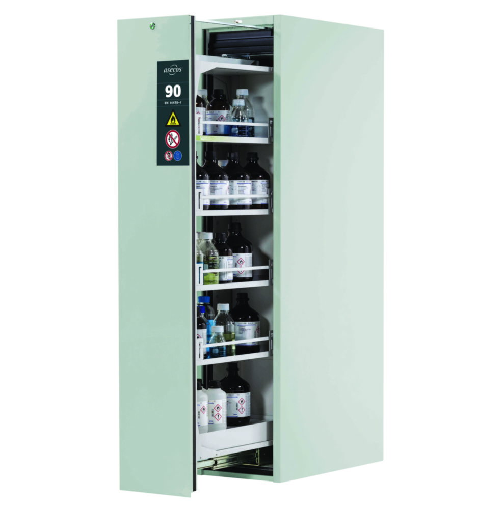 Die platzsparenden Sicherheitsschränke mit Vertikalauszug sorgen für optimale Übersicht und beidseitigen Zugriff auf alle eingelagerten Gebinde. Sichere und vorschriftsmäßige Lagerung entzündbarer Gefahrstoffe in Arbeitsräumen.