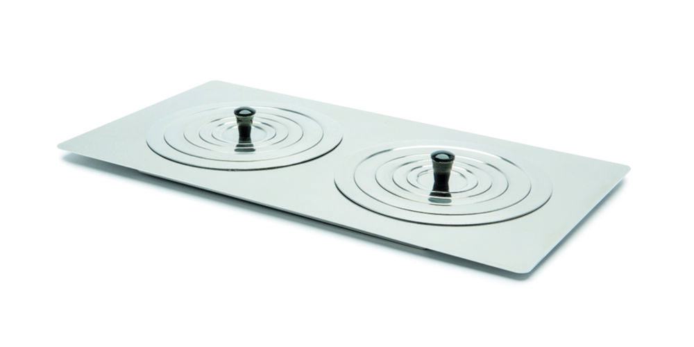 Flachdeckel für thermostatische Wasserbäder. Mit Ringsets von variablen Durchmesser zur Aufnahme großer Schiffe bei gleichzeitiger Reduzierung Verdunstung.